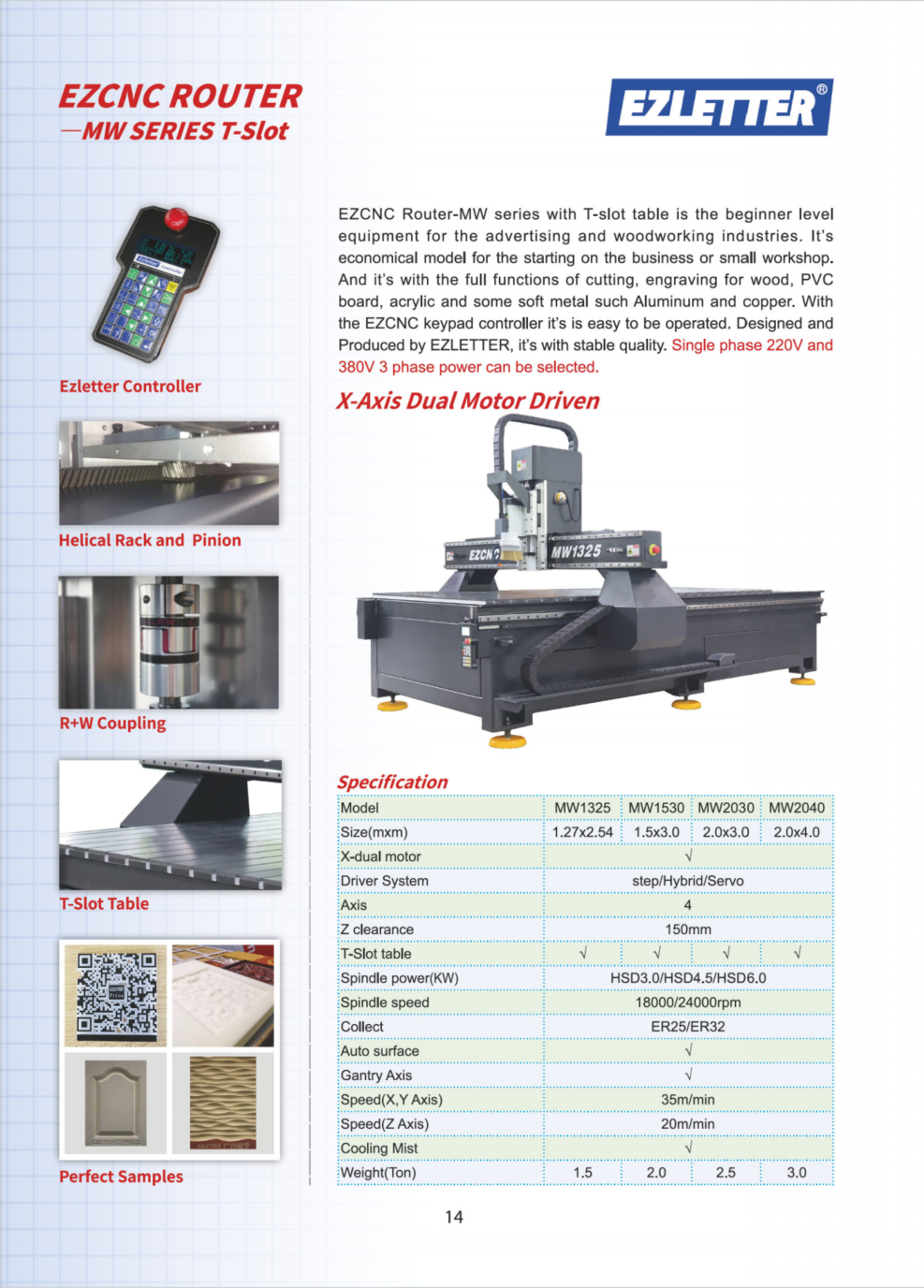 EZCNC Router-MW series with T-slot table is the beginner level equipment for the advertising and woodworking industries.It's economical model for the starting on the business or small workshop. And it's with the full functions of cutting, engraving for wood/PVC board/acrylic and some soft metal such Aluminum and copper. With EZCNC keypad controller, It is easy to operate.It with stable quality. And it can use single phase 220V power or 380V 3 phase power.